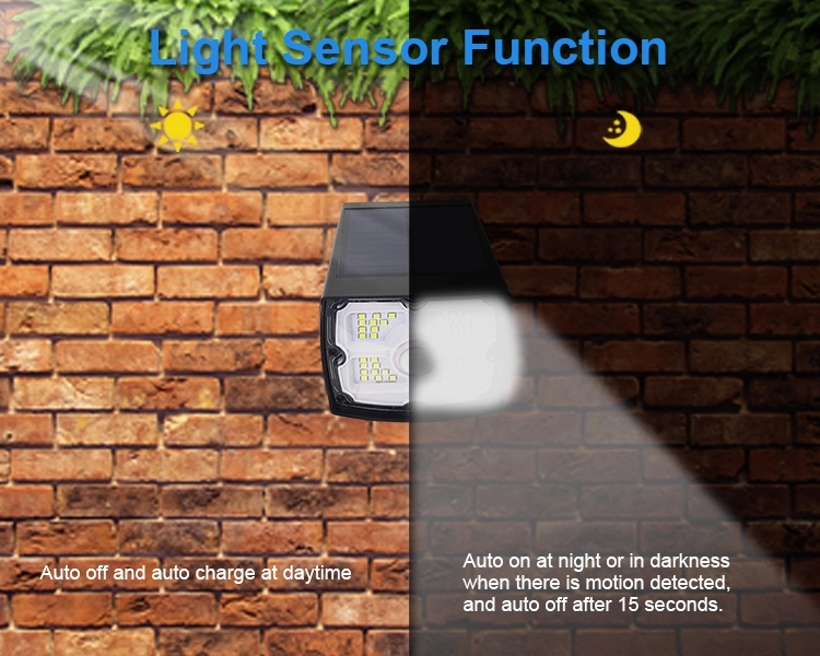 Smart Light Sensor Function - Auto charge in daytime and auto turn off at daytime. - Auto turn on at night or in darkness when there is no motion detected, and auto aff after 15 seconds |