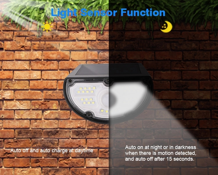 Light Sensor Function - Auto off and auto charge at daytime - Auto on at night or in darkness when there is motion detected, and auto off after 15 seconds |