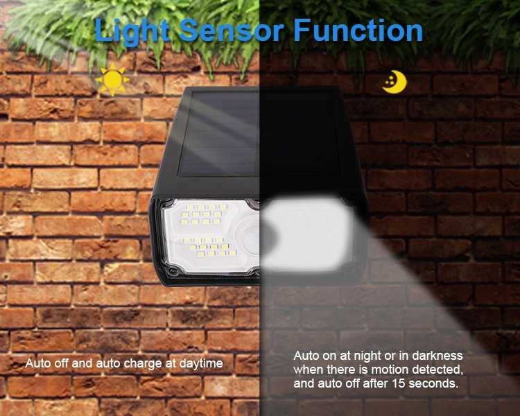 Light Sensor Function - Auto off and auto charge at daytime - Auto on at night or in darkness when there is motion detected, and auto off after 15 seconds |